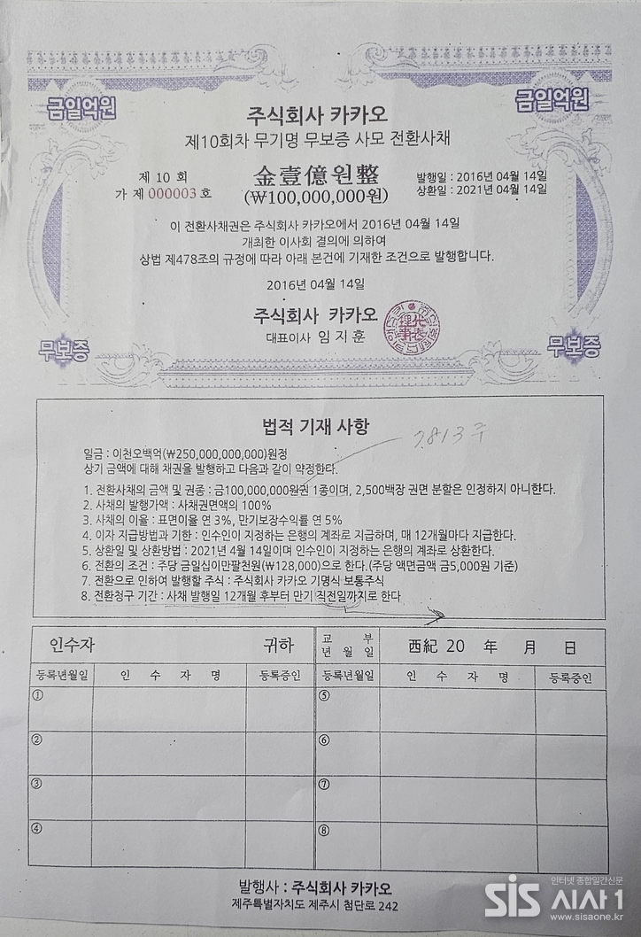 시사1은 또 A 씨와의 전화 통화에서 이 무기명 카카오 전환사채가 도장도 틀리고 하는데, 문제가 없느냐는 질문에 “A 씨는 문제가 없다면서 곧 해결이 되니까 조금만 기다려 달라”고 말했다.