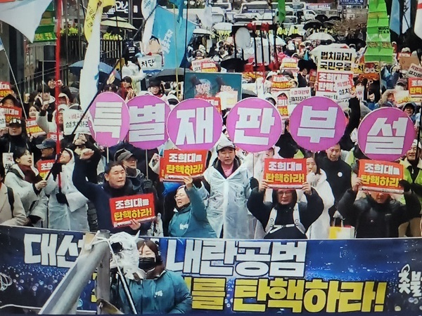 사전집회가 끝나고 참가자들은 본행사장인 국회앞으로 거리행진을 하며 '조희대 탄핵' '특별재판부 설치' 등을 연신 외쳤다. 이날 오후 5시부터 국회 앞에서 168차 촛불집회 콘서트가 진행됐다.