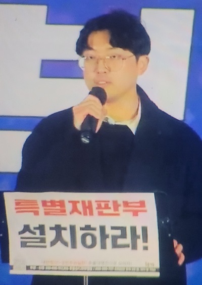 13일 서울 서초구 대법원 앞에서 열린 ‘내란청산·국민주권 실현 촉구 169차 촛불대행진’에서 청년촛불행동 회원 김태성 씨가 무대 발언을 통해 “조희대 사법부가 막가파식으로 가는 것은 특별재판부 설치 시 내란공범으로 처벌받게 되기 때문”이라고 주장했다.