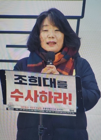 윤미향 김복동평화센터 공동대표는 27일 오후 4시부터 서울 서초구 대법원 앞에서 촛불행동 주최로 열린 '171차 내란청산-국민주권실현 촉구 촛불대행진' 집회 무대에서 발언을 했다.