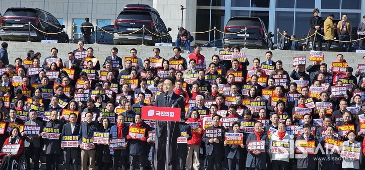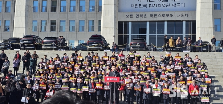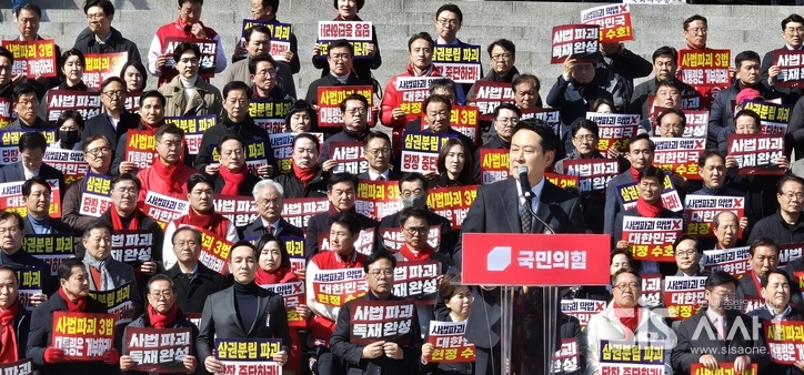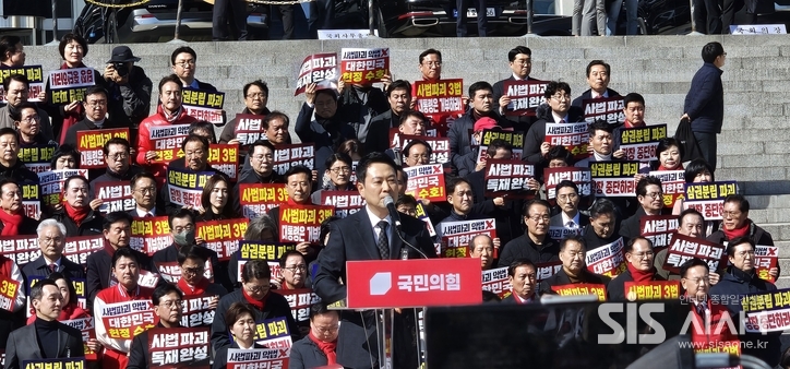 시사1 윤여진 기자 | 국민의힘이 3일 국회 본청 앞 계단에서 열린 '사법독립 헌정수호를 위한 대국민 호소 국민대장정 규탄대회' 출정식을 진행했다.