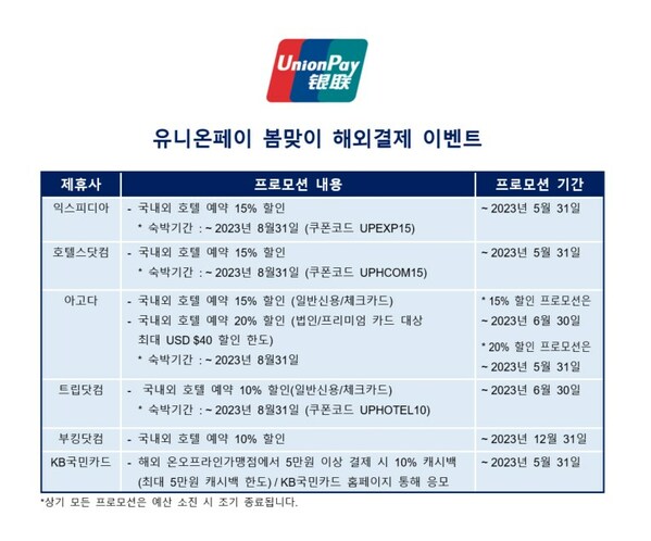아고다에서는 유니온페이 일반 신용 및 체크카드로 결제 시 6월 30일까지 15% 할인, 법인 및 프리미엄카드 결제 시 5월 31일까지 20% 할인을 최대 USD 40불까지 받을 수 있다. 부킹닷컴에서는 유니온페이 카드 결제 시 10% 할인이 되는 프로모션을 올 연말까지 진행한다.