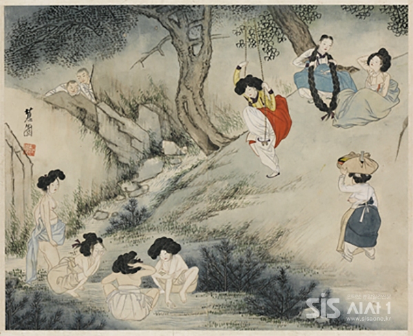 음력 5월 5일 단오날, 그네타기 놀이를 나온 한 떼의 여인네들이 시냇가에 그네를 매고 냇물에 몸을 씻으며 즐기고 있다. 그넷줄을 드리울만한 거목이 있고 맑은 물이 굽이쳐 흐르는 곳이라면 당시의 서울에서야 얼마든지 있었을 것이다.
