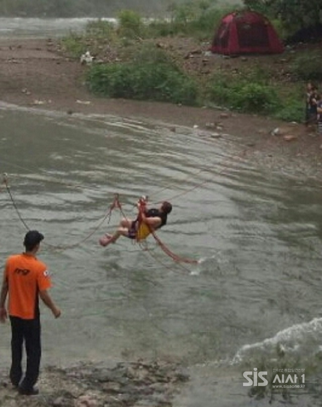 경기도 연천군 동막골 아마촌 냇가에서 일요일인 24일 오후 텐트를 치고 피서중인 14명이 폭우로 불어난 물에 고립되었다.