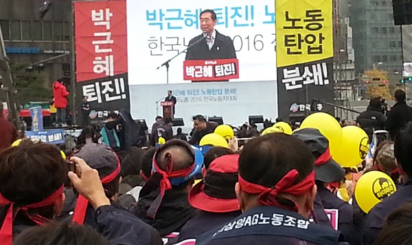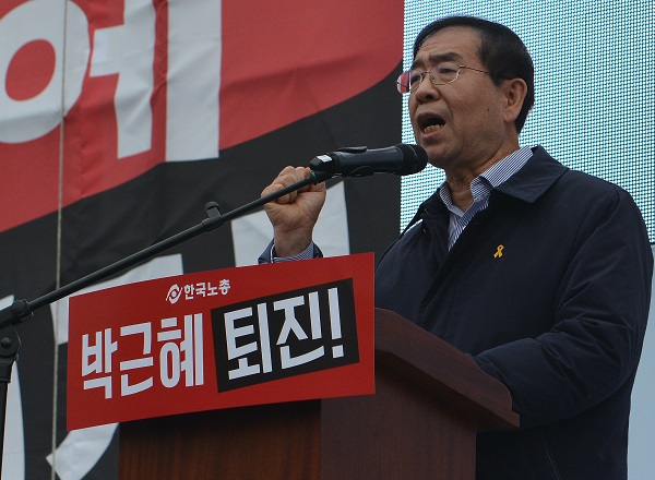 한국노총 전국노동자대회 연대사를 한 박원순 서울시장이 “박근혜 최순실 게이트는 청와대와 재벌의 추악한 결탁의 모습을 적나라하게 보여줬다”고 밝혔다.