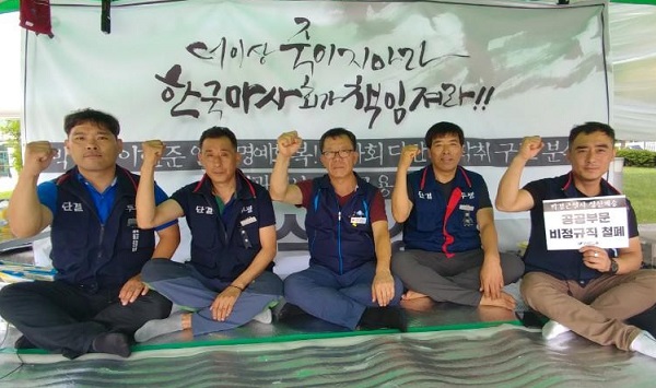 릴레이 농성에 동참하고 있는 농성 노동자들은 ‘더 이상 죽이지 마라’, ‘한국마사회가 책임져라’, ‘고 박경근·이현준 열사 명예회복’ 등을 주장했다.