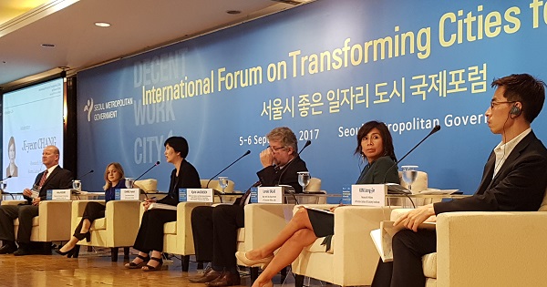 지난 9월 5일 오후 서울 을지로 롯데호텔 사파이어볼룸에서 열린 서울시 좋은 일자리 도시국제포럼 두 번째 세션 ‘좋은 일자리 도시-사회적 보호와 일터의 권리’란 의제에 대해 장지연 한국노동연구원 선임 연구위원의 사회로 국·내외 전문가들이 주제발표를 했다.
