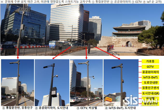 숭례문에는 숭례문 소개, 사진, 길 안내 등의 정보를 볼 수 있는 도시안내 QR코드, 무료 공공와이파이, 지능형CCTV, S-DoT 등이 결합된 가로등 스마트폴을 설치했다.