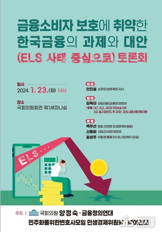 (시사1 = 김갑열 기자) 양정숙 국회의원은 오는 23일 오후 2시 국회의원회관 제1세미나실에서 홍콩H지수 ELS 피해자, 금융 전문가 등과 함께 ‘금융소비자 보호에 취약한 한국금융의 과제와 대안(ELS 사태 중심으로) 토론회’를 개최한다고 22일 밝혔다.